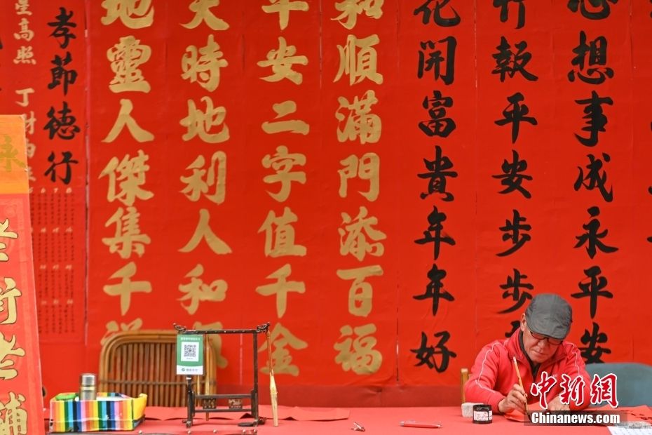 广东省佛山市,书法爱好者在“挥春街”为市民写挥春。挥春也作春联、门联、福贴,粤语地区称挥春,佛山市的快子路是当地有名的“挥春街”,随着农历新年的临近,书法爱好者毛笔书写的挥春吸引不少市民前来挑选。 中新网