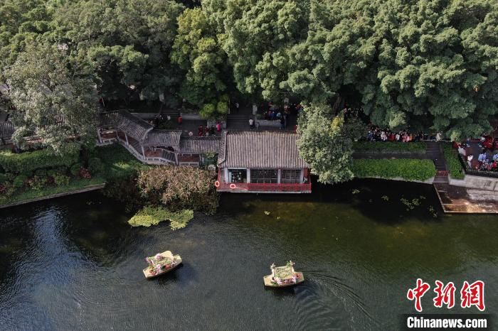 主播身穿汉服乘坐花舫在荔湾湖水面巡游。中新网