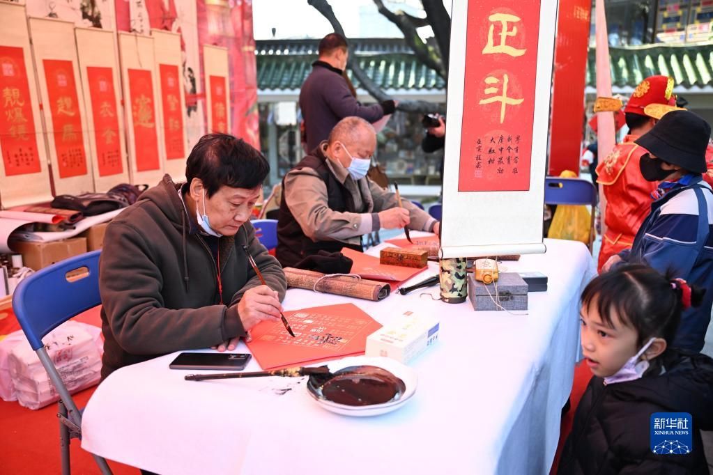 1月18日,书法家在水上花市启动仪式上为市民写春联。新华社