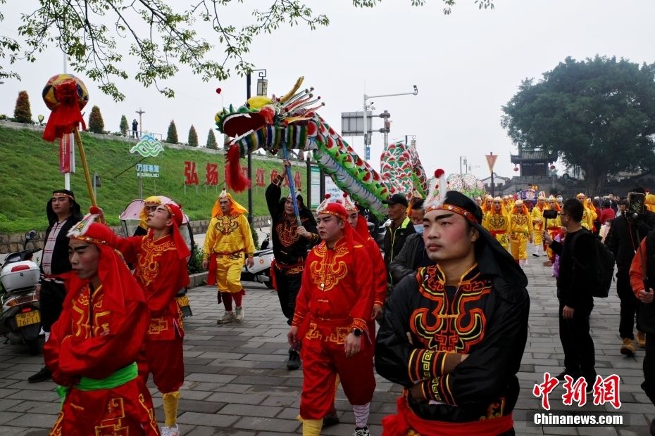 民间艺人在龙湖古寨内进行舞龙表演。