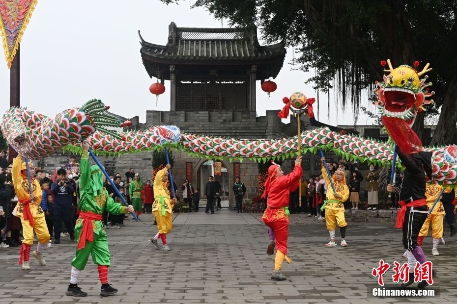 龙湖古寨内的舞龙表演吸引众多游客观看拍照。