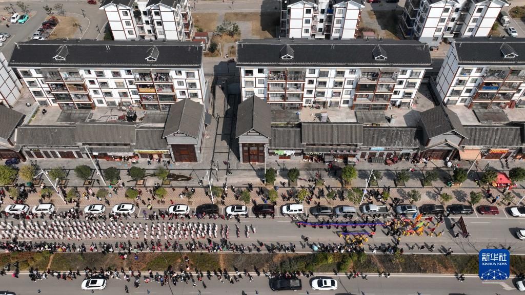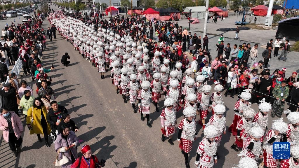 1月31日,苗族同胞在贵州省黔东南苗族侗族自治州黄平县谷陇镇盛装巡游(无人机照片)。新华社