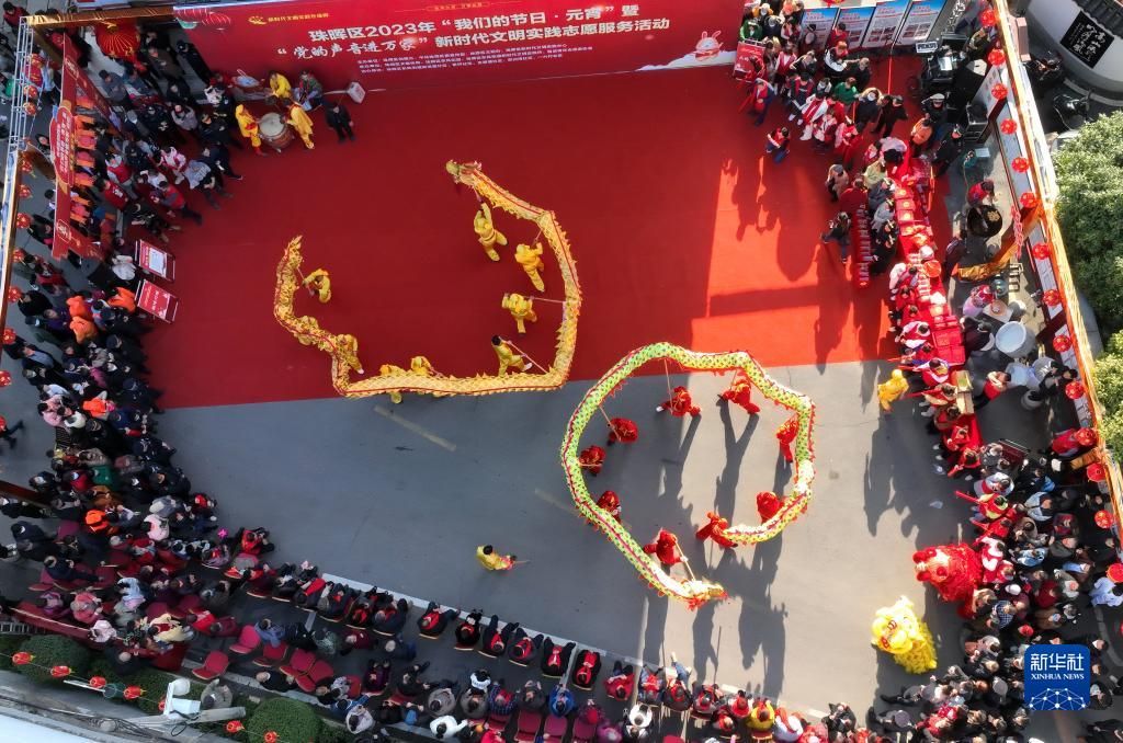 1月31日,在湖南省衡阳市珠晖区东风街道前进里社区,人们舞龙舞狮迎接元宵节的到来(无人机照片)。新华社