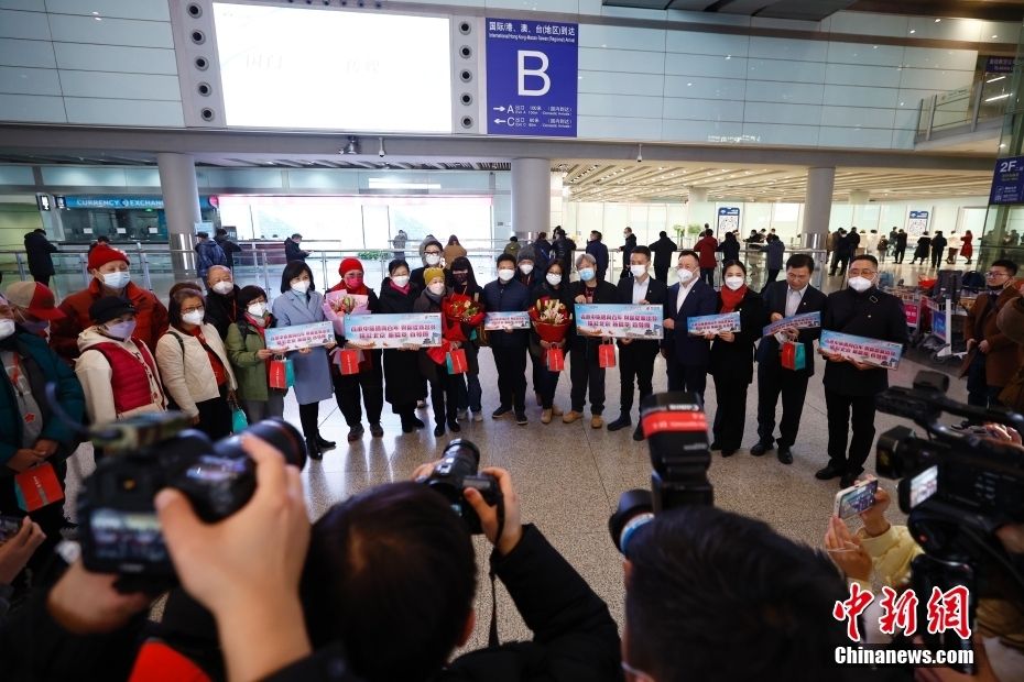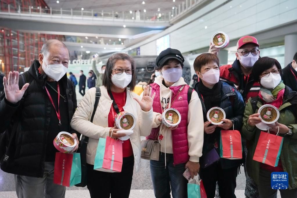 2月6日,内地与港澳人员往来全面恢复后,香港赴北京首个旅游团的游客在首都国际机场参加欢迎仪式。新华社