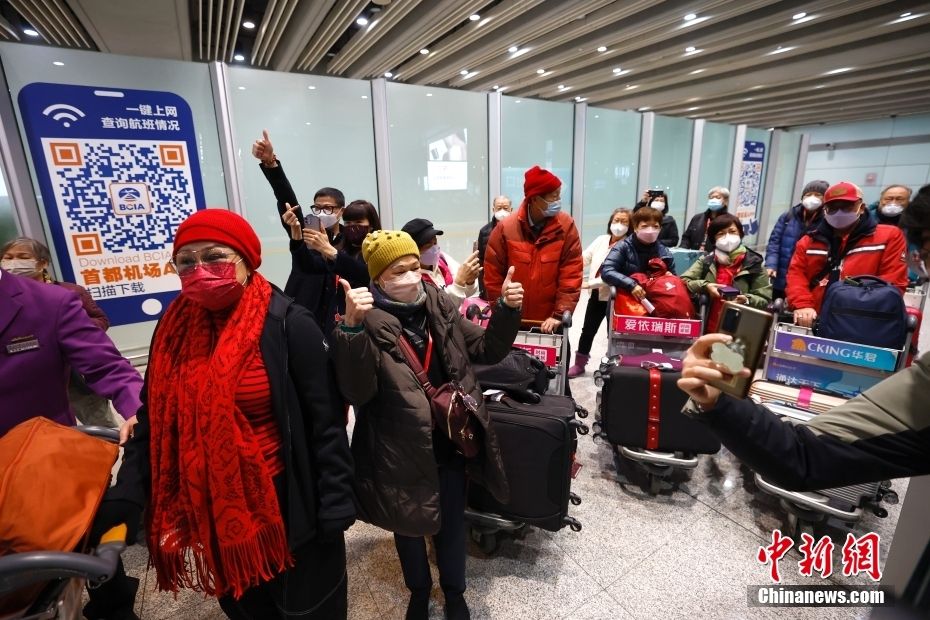 2月6日,内地与港澳人员往来全面恢复后,香港赴北京首个旅游团的游客在首都国际机场合影留念。新华社