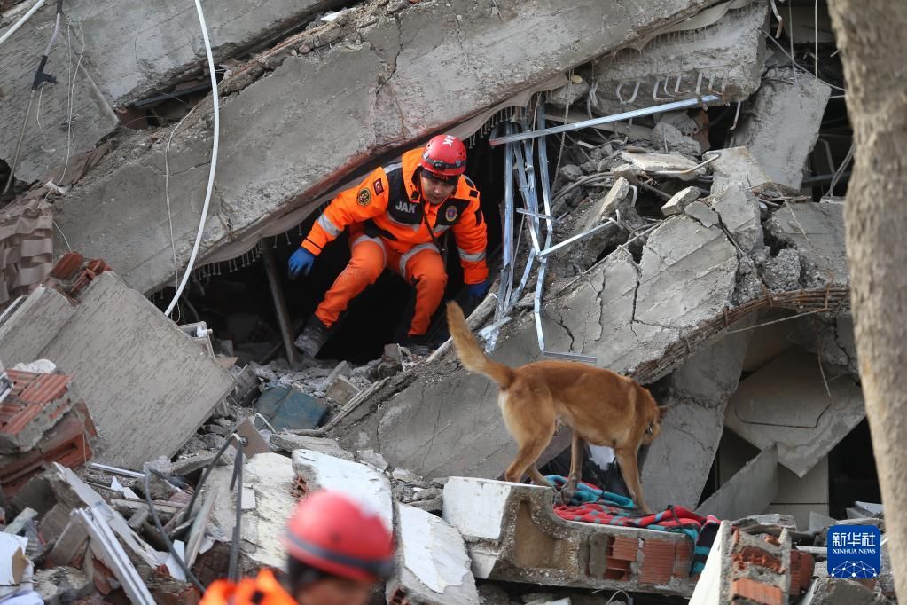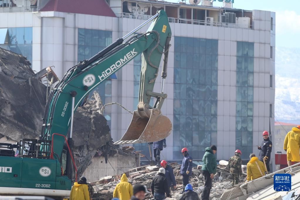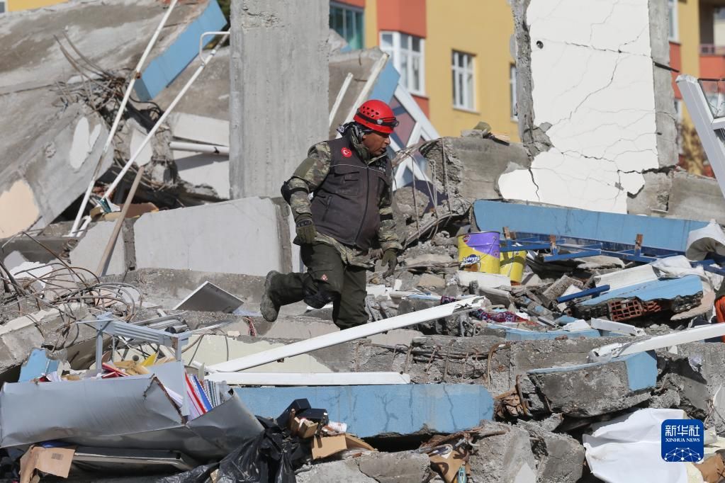 7日,救援人员在土耳其南部卡赫拉曼马拉什市地震废墟中搜寻幸存者。