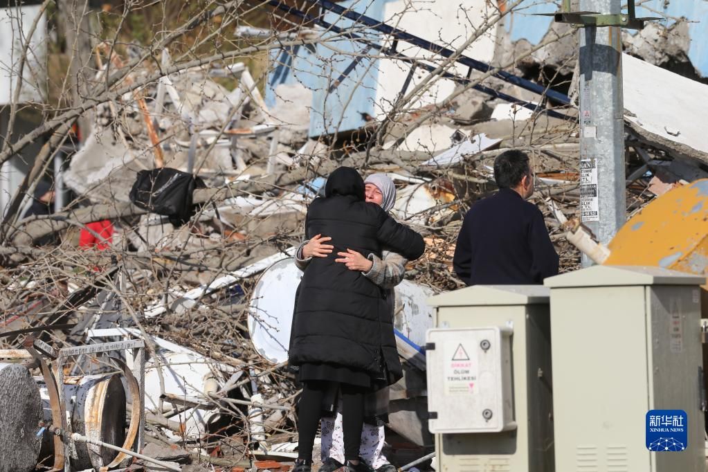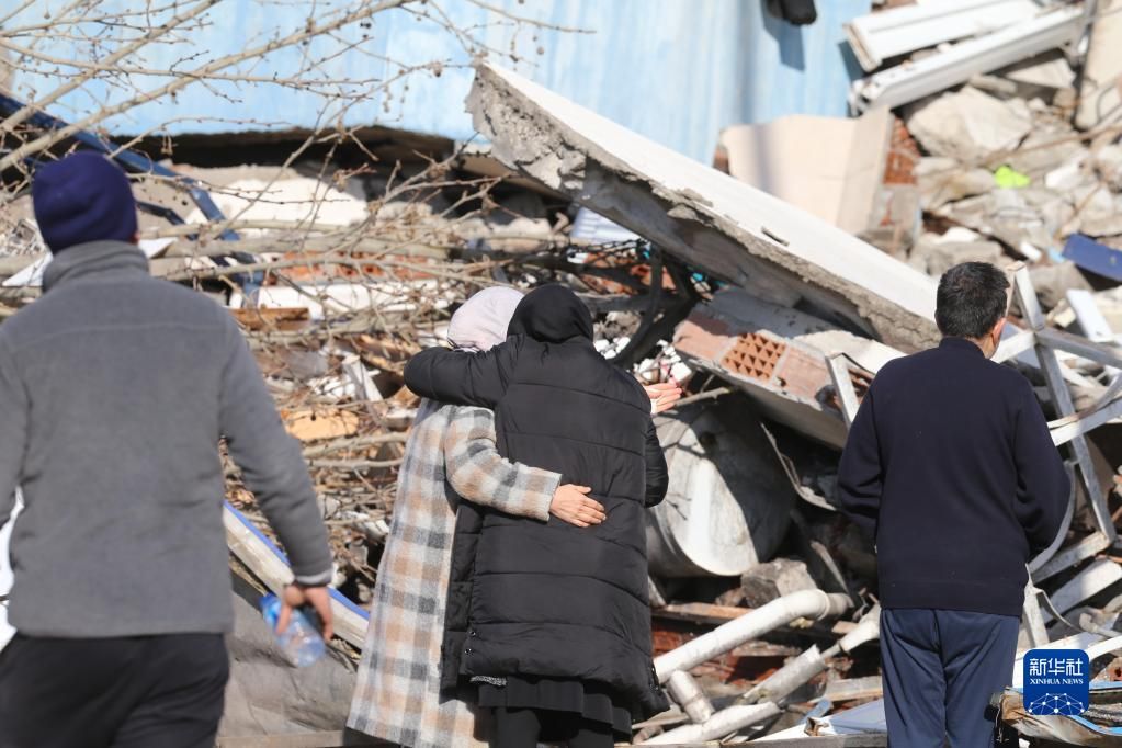 7日,灾民在土耳其南部卡赫拉曼马拉什市一处地震废墟前相互安慰。