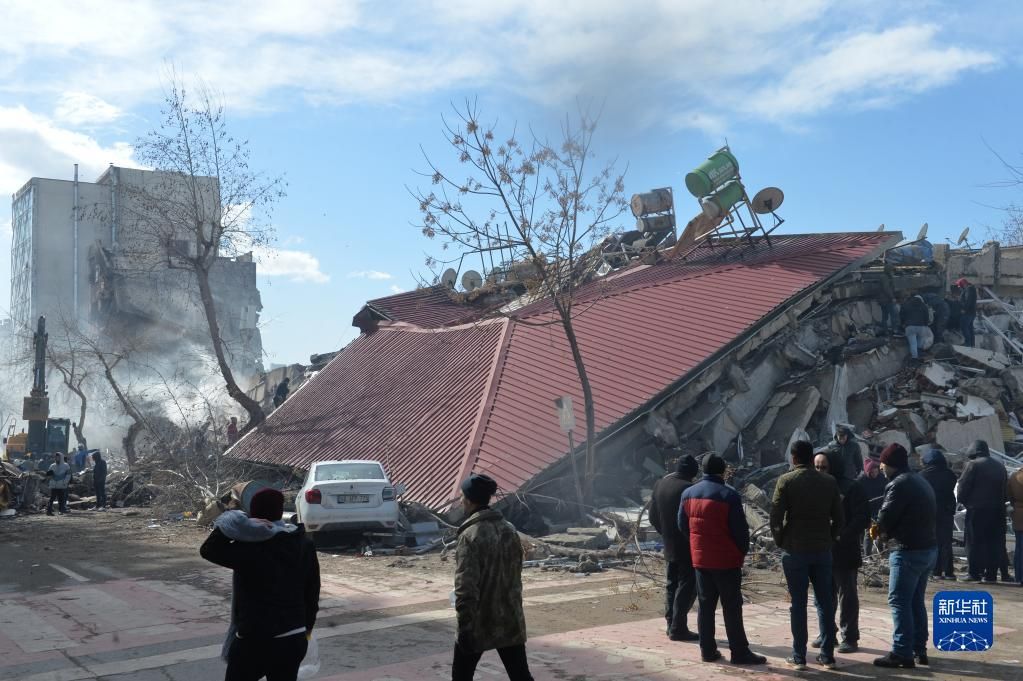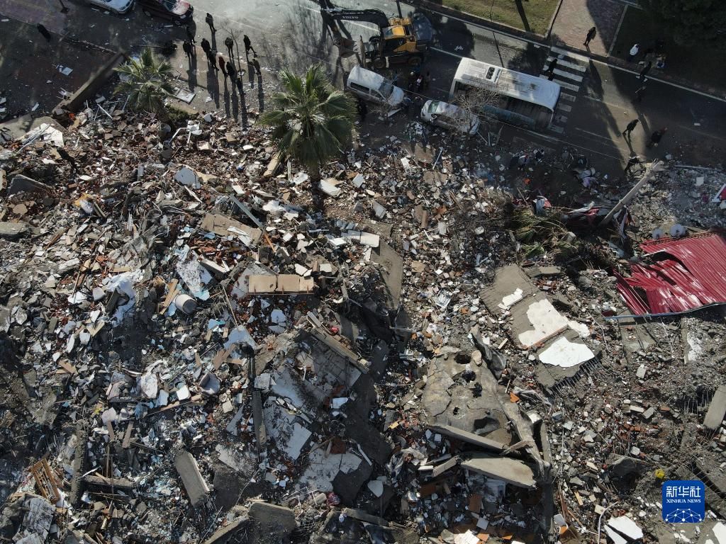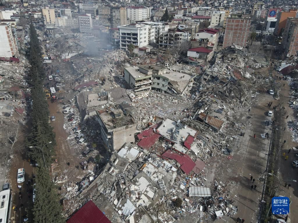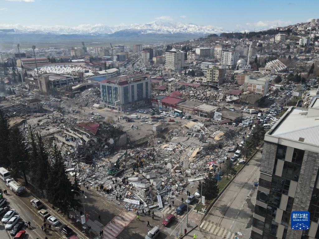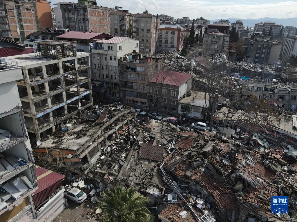 2月7日在土耳其南部卡赫拉曼马拉什市市中心拍摄的震后景象(无人机照片)。卡赫拉曼马拉什市是本次地震重灾区卡赫拉曼马拉什省省会,是遭受地震破坏最为严重的城市之一。
