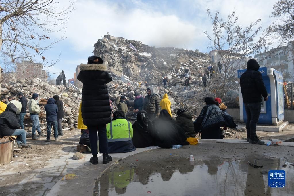 7日,灾民在土耳其南部卡赫拉曼马拉什市一处地震废墟前守候。