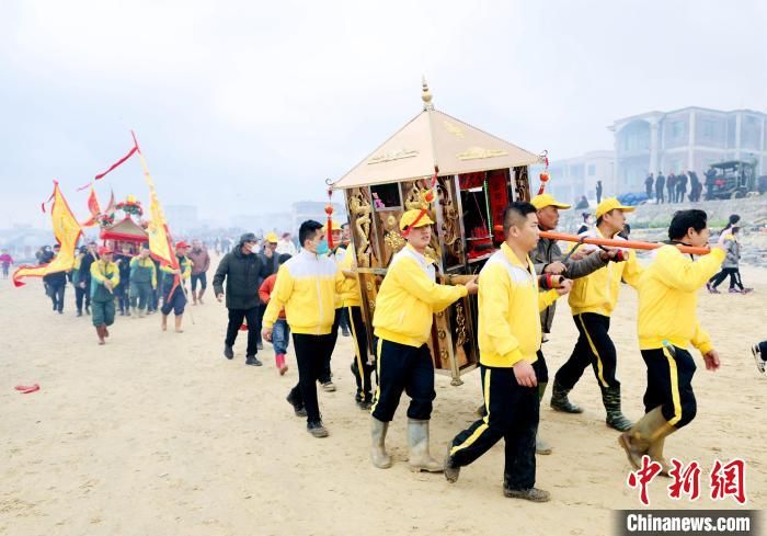 2月8日,福建省莆田市南日岛浮叶村,在信众肩扛手抬下,一顶顶神轿鱼贯而出,浩荡出游。在村里绕上一圈后来到海滩上,村中年轻人抬着供奉神灵的轿子,踩着海水,在海滩上颠簸搏击。图为信众抬着神轿出游。