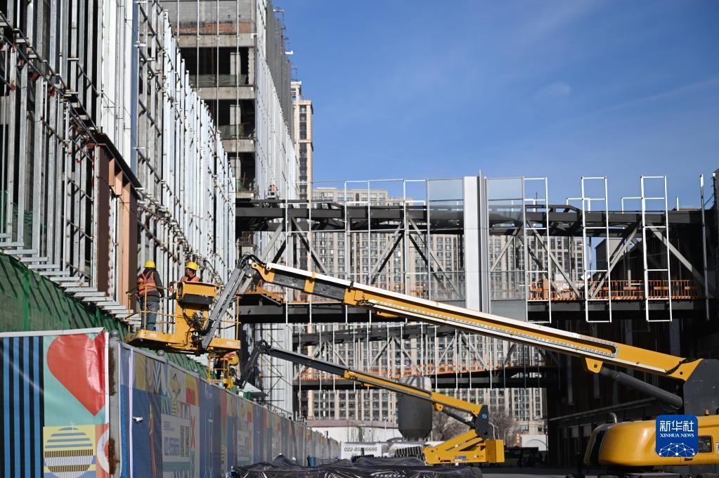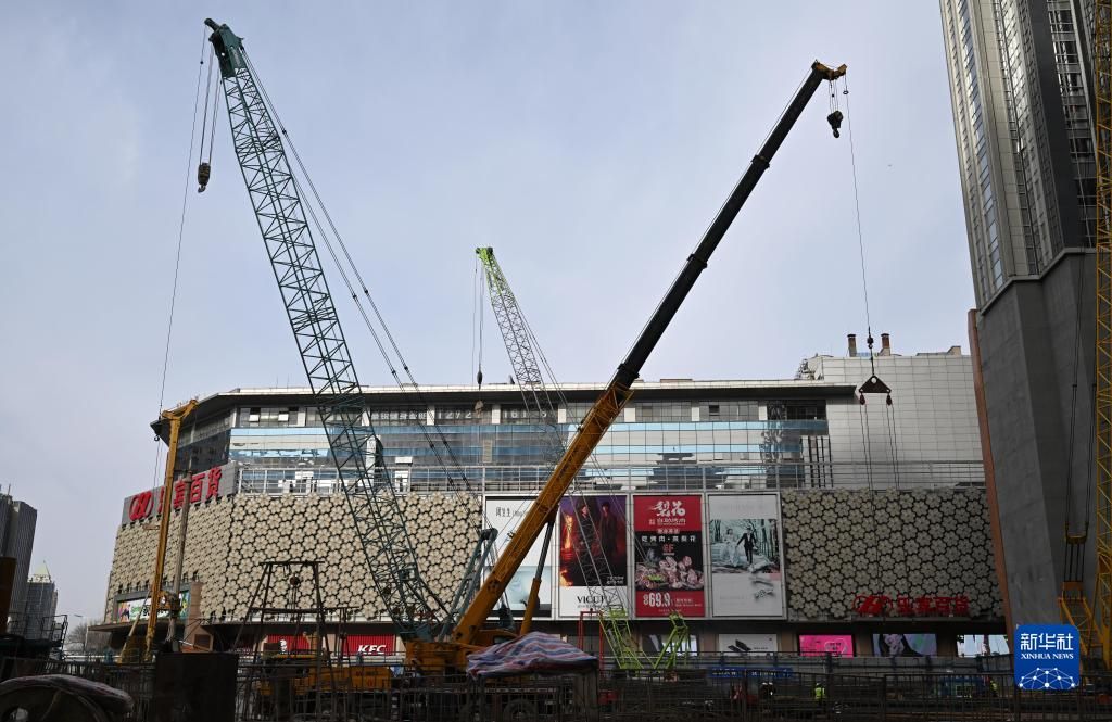 2月14日,工人在位于天津市和平区金街商圈的印象城项目现场施工。