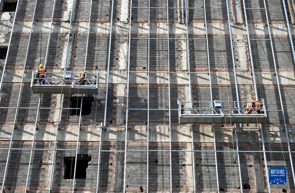 工人在位于天津市和平区金街商圈的印象城项目现场施工。