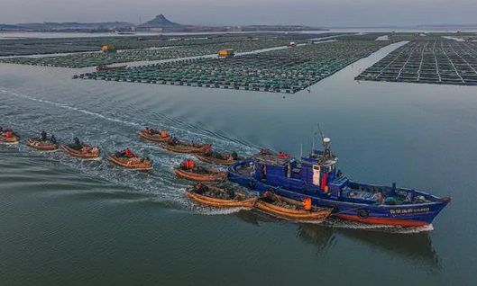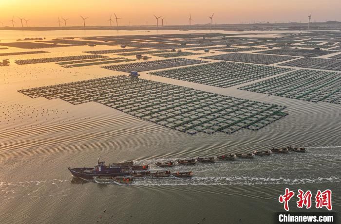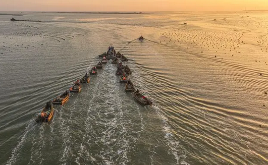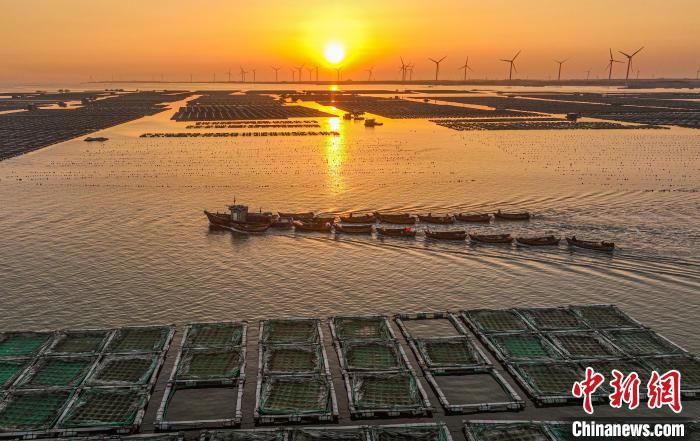 2月16日,在山东省荣成市石岛管理区桑沟湾海洋牧场养殖区,渔民们迎着朝阳驾驶渔船出海作业,海上生产一派繁忙景象。
