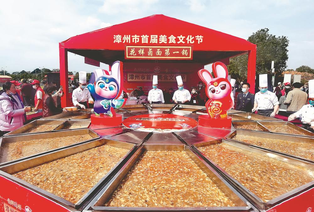 美食文化节现场,工作人员在直径6米的“花样卤面第一锅”前免费向群众分发卤面。福建日报