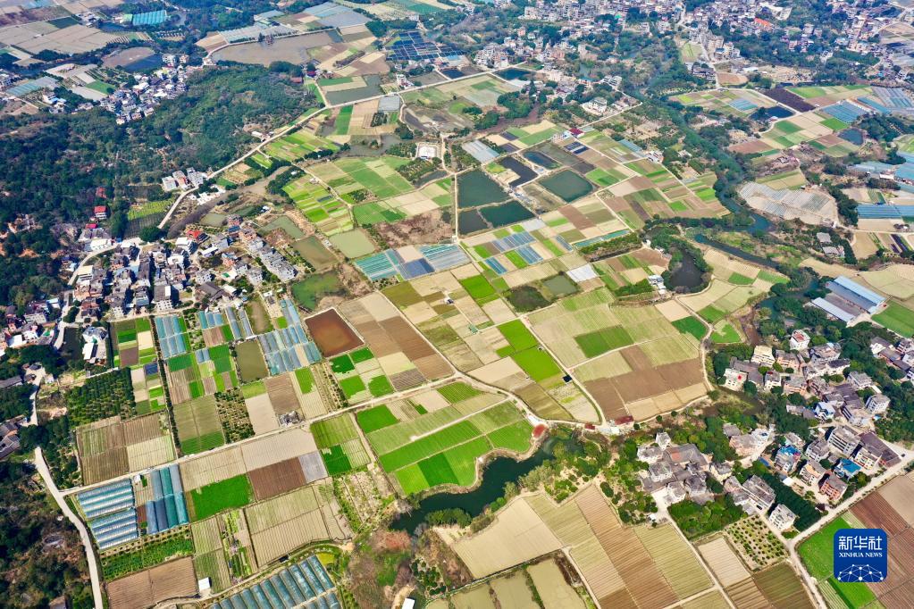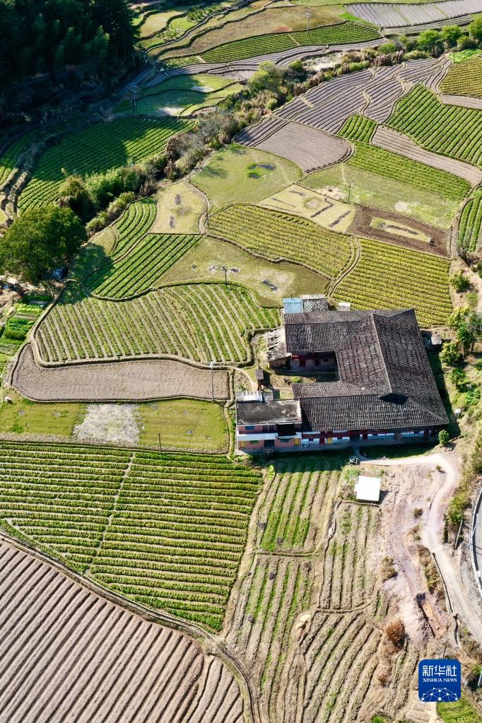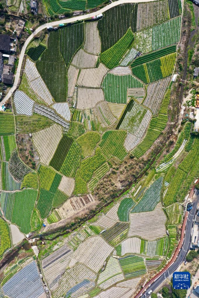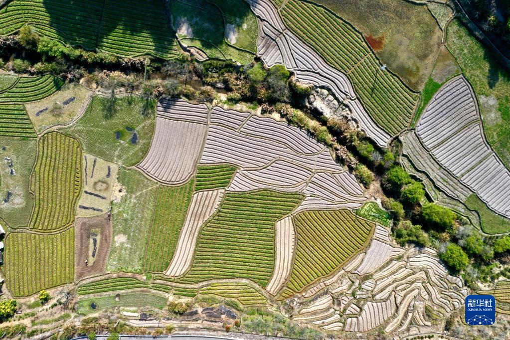 春耕时节,在中国福建省福州市乡村山岭间,一块块形状各异、五彩斑斓的田地犹如大地上的拼图,呈现别样的春耕画卷。