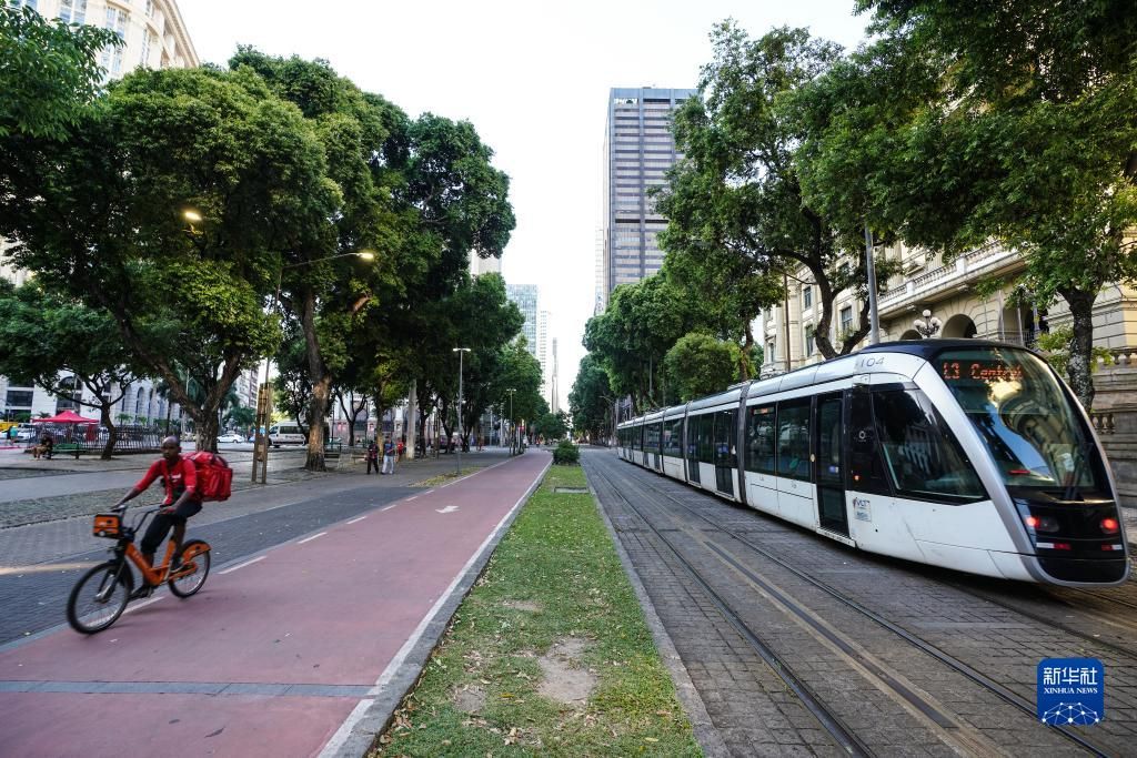 3月1日,一辆轻轨列车驶过巴西里约热内卢市中心街道。