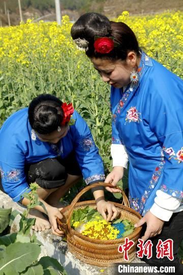3月5日,贵州省黔东南苗族侗族自治州施秉县迎来一年一度的苗族姊妹节,苗族群众载歌载舞,欢庆节日的到来。图为施秉县马号镇六合苗寨苗族群众给姊妹饭添加“春”的味道。
