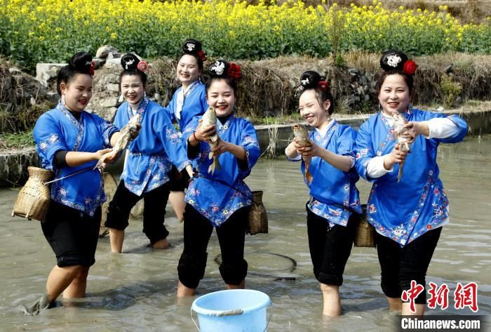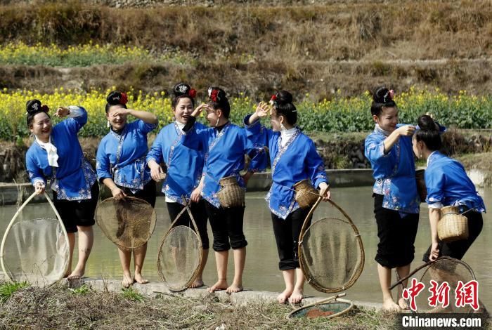 施秉县马号镇六合苗寨苗族群众准备下田捉鱼捞虾。