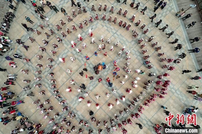 施秉县苗族群众在姊妹节上跳苗族踩鼓舞(无人机拍摄)。