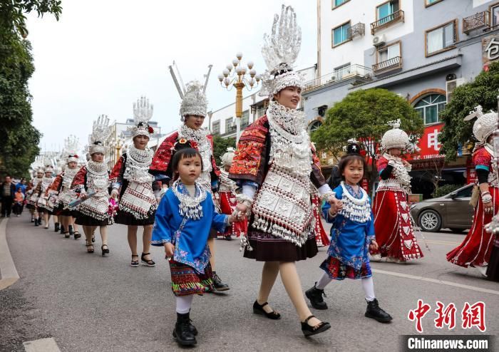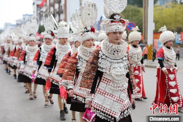 施秉县苗族群众在参加姊妹节盛装巡游。