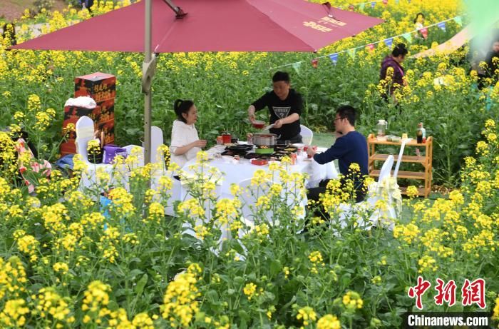 又是一年赏花时,这次终于轮到油菜花!金黄、灿烂、浓烈,她是美丽春天的代言人。中国多地民众纷纷踏青赏花,享受在花海的美丽风光。 3月5日,重庆江津金色黄庄万亩油菜花盛开,市民在油菜花海中品尝地道重庆火锅,享受惬意生活。图为市民在油菜花海里吃火锅。中新网