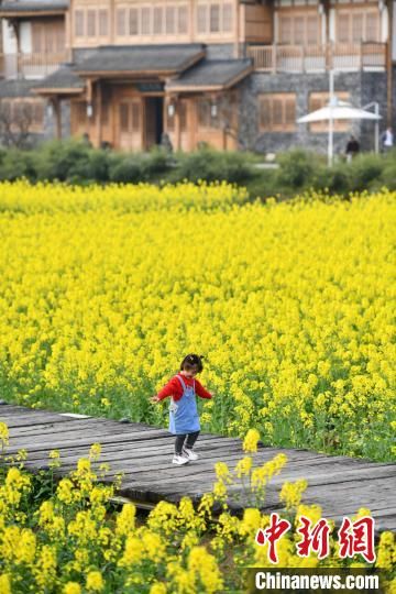 3月6日,四川成都官塘新村被油菜花田包围,春色如画,吸引不少游客前来打卡拍照。官塘新村经过聚落重建、古建复原,再现了川西林盘风貌。图为孩童在官塘新村前的油菜花田中游玩。中新网