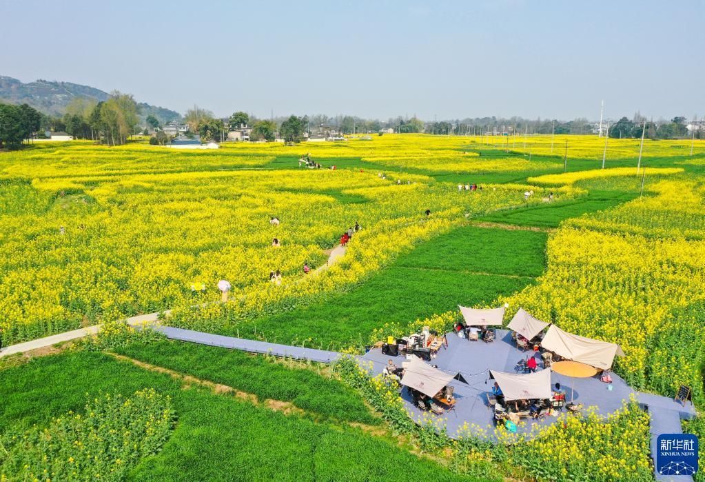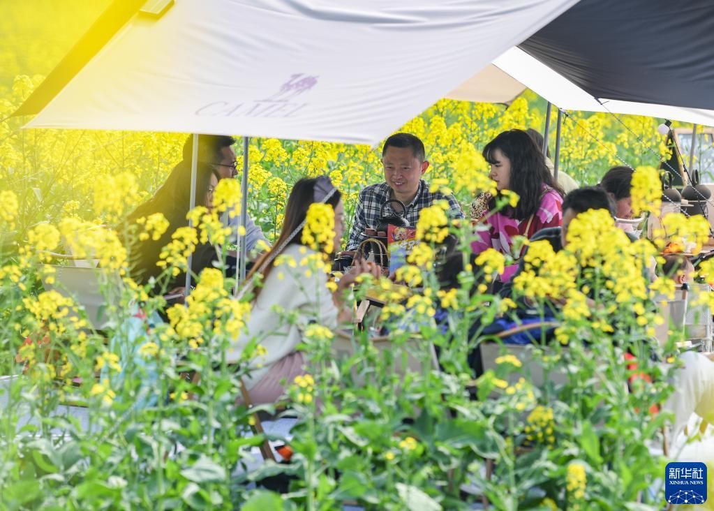 近年来,崇州市打造“自驾赏花节”等活动,植入轻食、茶饮、集市、露营等消费业态,打造“赏花经济”,拉动乡村旅游消费回暖,助力乡村振兴。近日,位于四川成都崇州市的数万亩油菜花竞相绽放,吸引游客前来踏春观光。图为3月5日,在四川省崇州市道明镇,游客在油菜花田中观光休闲。新华社
