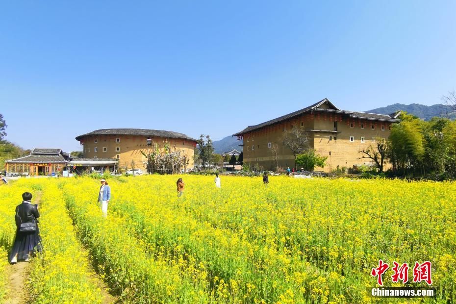 3月6日,福建省漳州市南靖县土楼景区的油菜花竞相开放,成片油菜花与土楼相衬,美不胜收,吸引不少游客前来踏青赏花。中新网