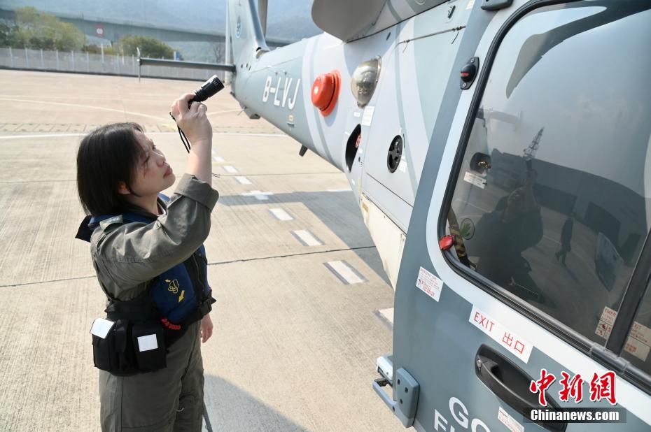 甄淑贤在每次进行飞行任务前,都会仔细检查直升机各处,确保飞行安全。