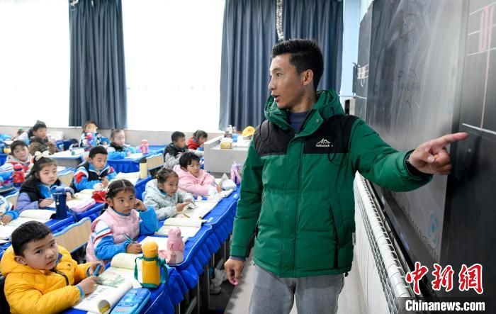 3月14日,西藏拉萨市第一小学藏语文老师拉巴次仁在课堂上。