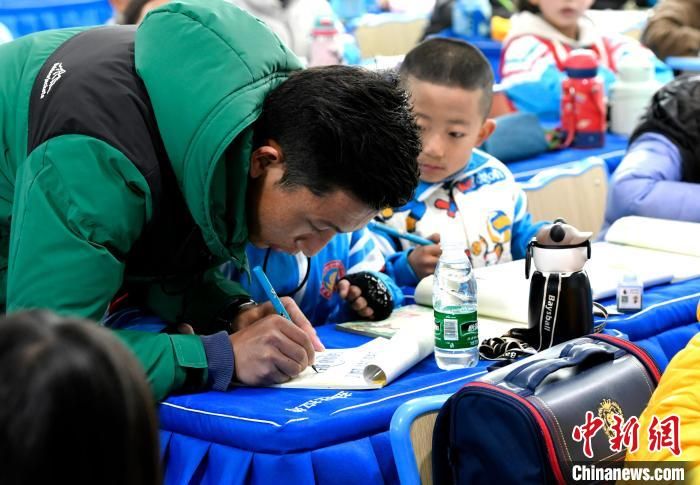 3月14日,西藏拉萨市第一小学藏语文老师拉巴次仁在课堂上手把手教学生藏文书法。