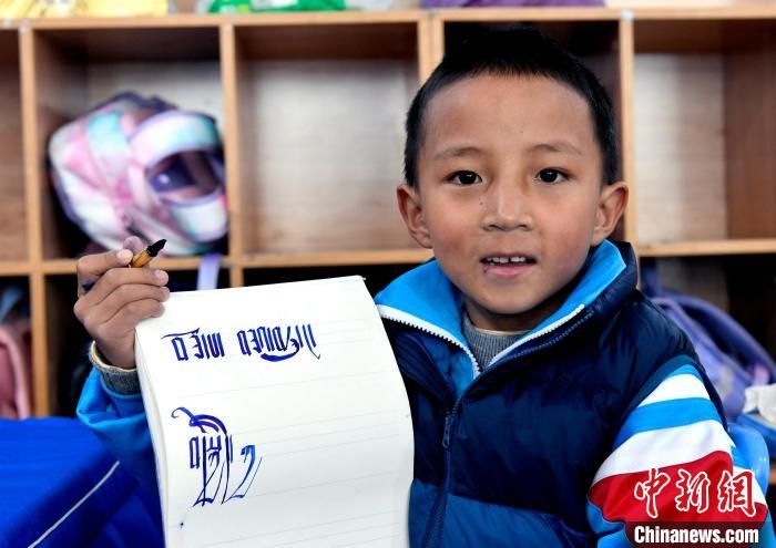 3月14日,西藏拉萨市第一小学一年级六班学生吉美旺堆展示自己书写的藏文。