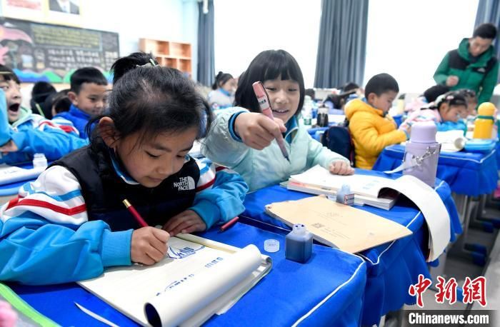 3月14日,西藏拉萨市第一小学一年级六班学生白玛朗珍(左)在藏语文课上书写藏文。
