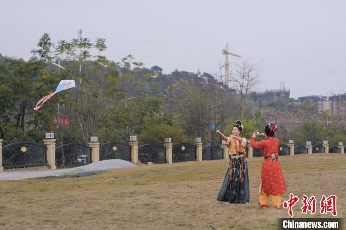 汉服爱好者正在玩“纸鸢”。