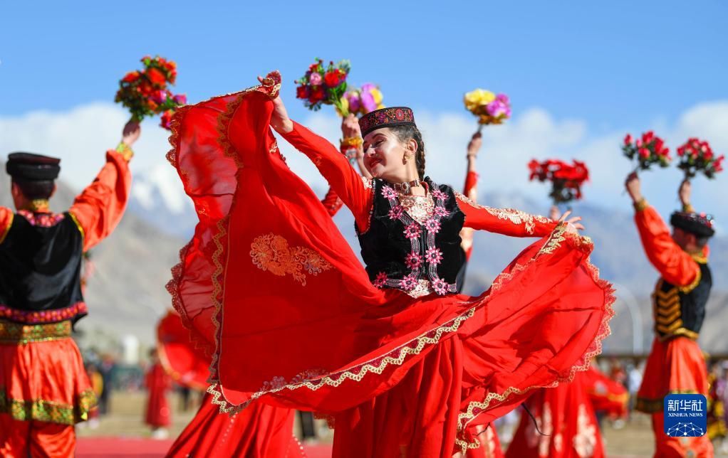 3月21日,以“我们的节日”为主题的中国新疆塔吉克族传统节日肖贡巴哈尔节系列活动在塔什库尔干塔吉克自治县开幕。肖贡巴哈尔节有“新年”“迎春”之意,当地民众载歌载舞与游客一起欢庆。图为3月21日,在新疆塔什库尔干塔吉克自治县非物质文化遗产展示园,歌舞演员为当地民众和游客表演节目。新华社