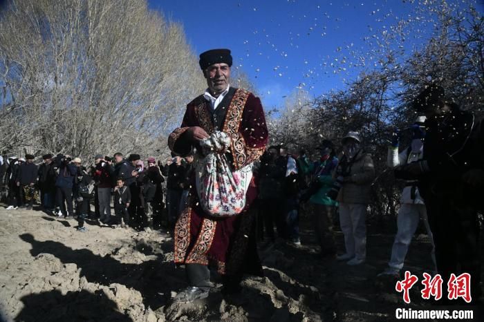 身穿盛装的阿瓦孜克·古力买买提,沿着翻耕的土地撒种。中新网