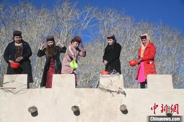 当日,头戴“库勒塔”帽子的塔吉克族妇女将水洒向即将从房屋中跑出来的每个男人,传达祝福。图为村庄里的女性在房屋顶上洒水。中新网