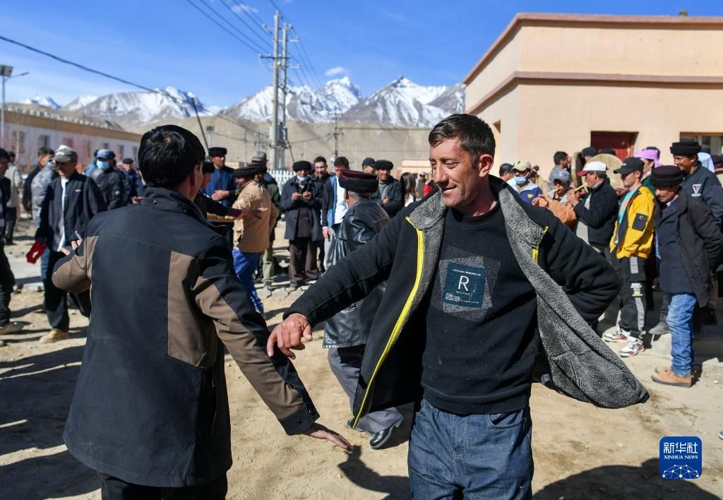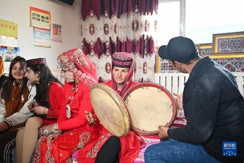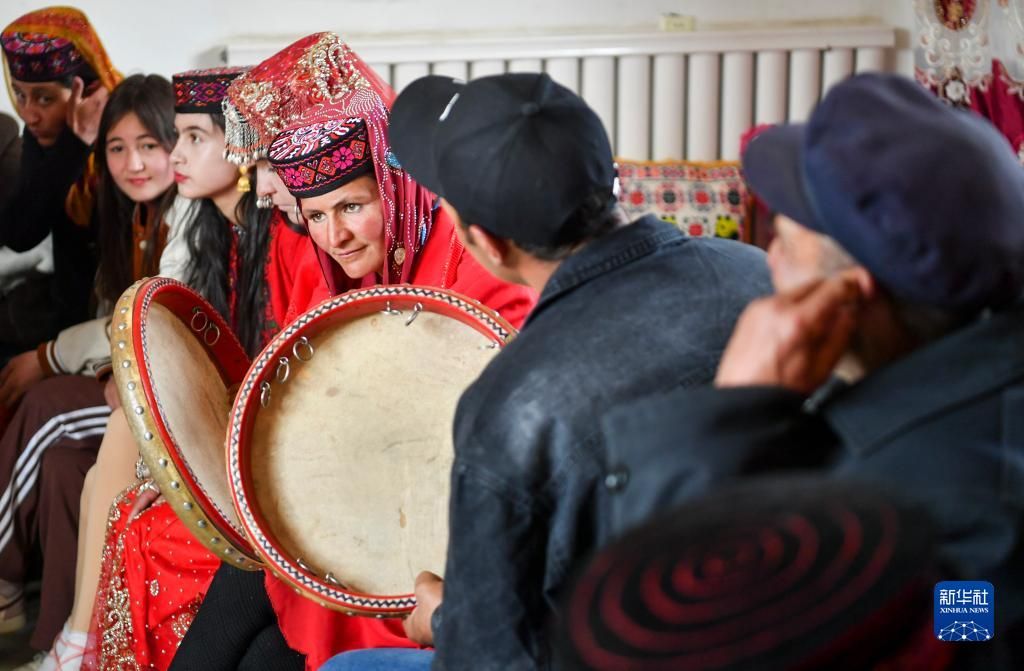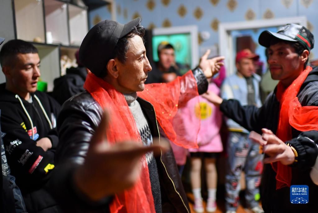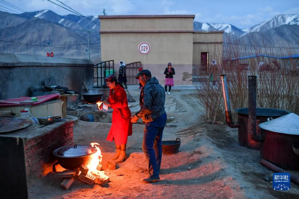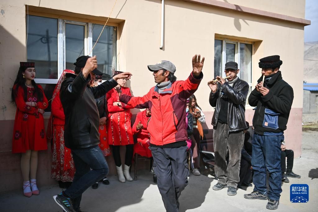 在脱贫摘帽后,这个全县最大的易地扶贫搬迁安置点已更名为富民村、爱民村,踏上接续推进乡村振兴的新征程。像这对新婚夫妇一样,还有更多的年轻人在搬迁新村迎接更幸福的生活。 图为新娘古丽汗·赞加比力的亲友在家门口吹鹰笛、跳舞庆祝(3月18日摄)。