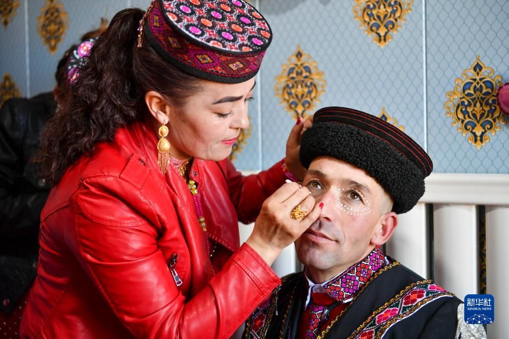 迎亲前,亲友用石粉在新郎买热买提汗·青铁木尔的眼周化妆(3月19日摄)。