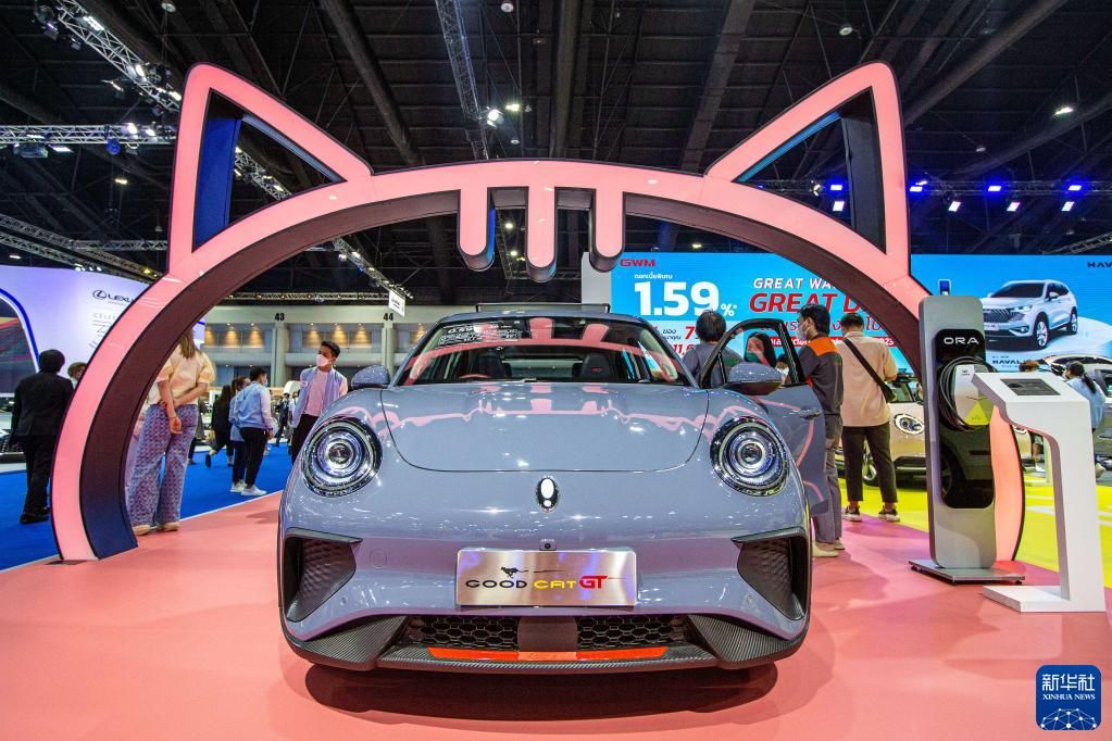 3月22日,第44届曼谷国际车展开幕。多家中国汽车品牌亮相车展,吸引消费者关注。图为当日,观众在泰国曼谷国际车展上参观欧拉好猫GT汽车。