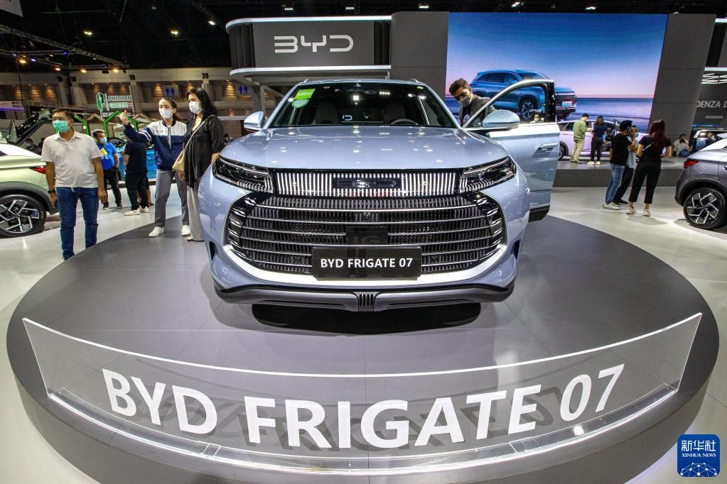 观众在泰国曼谷国际车展上参观比亚迪护卫舰07汽车。