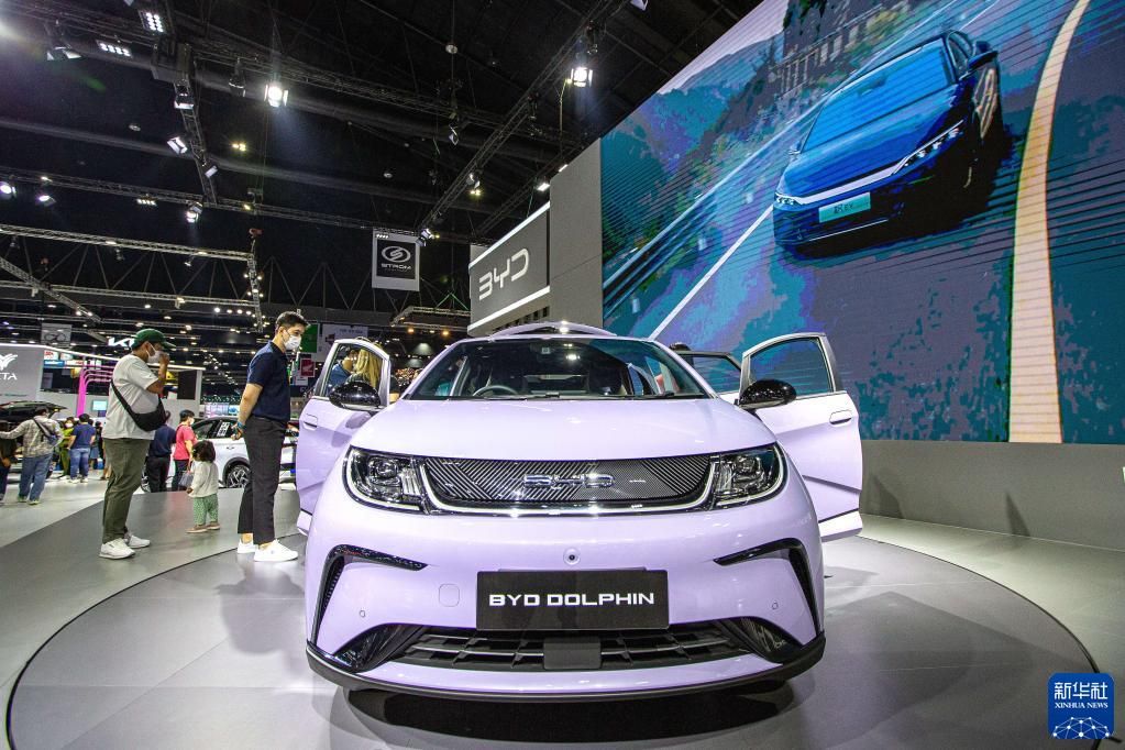 观众在泰国曼谷国际车展上参观比亚迪海豚汽车。