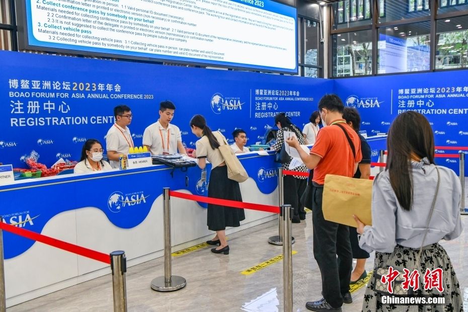 27日,在博鳌亚洲论坛2023年年会注册中心,工作人员为嘉宾办理注册手续。中新网