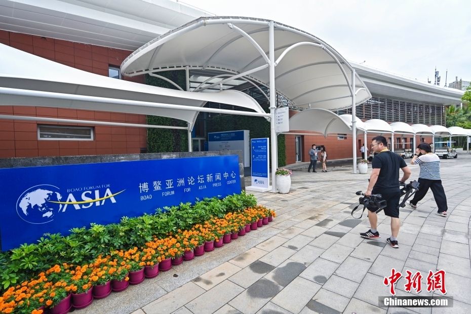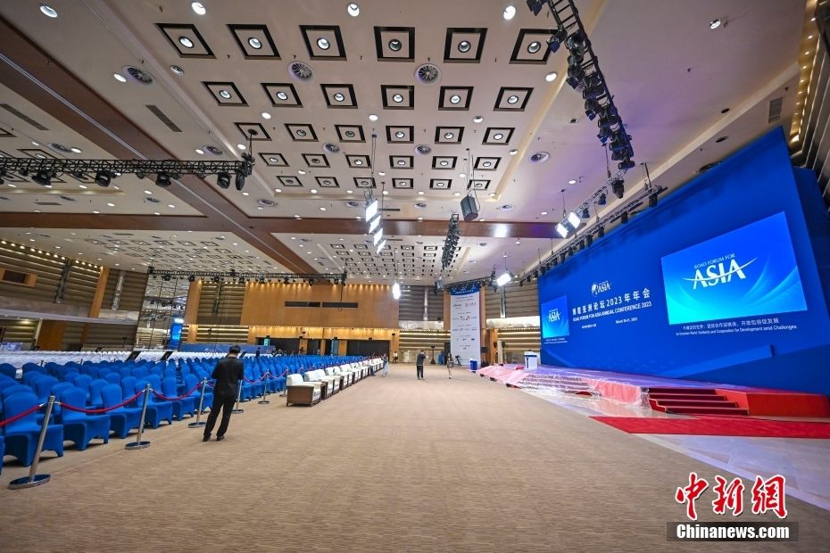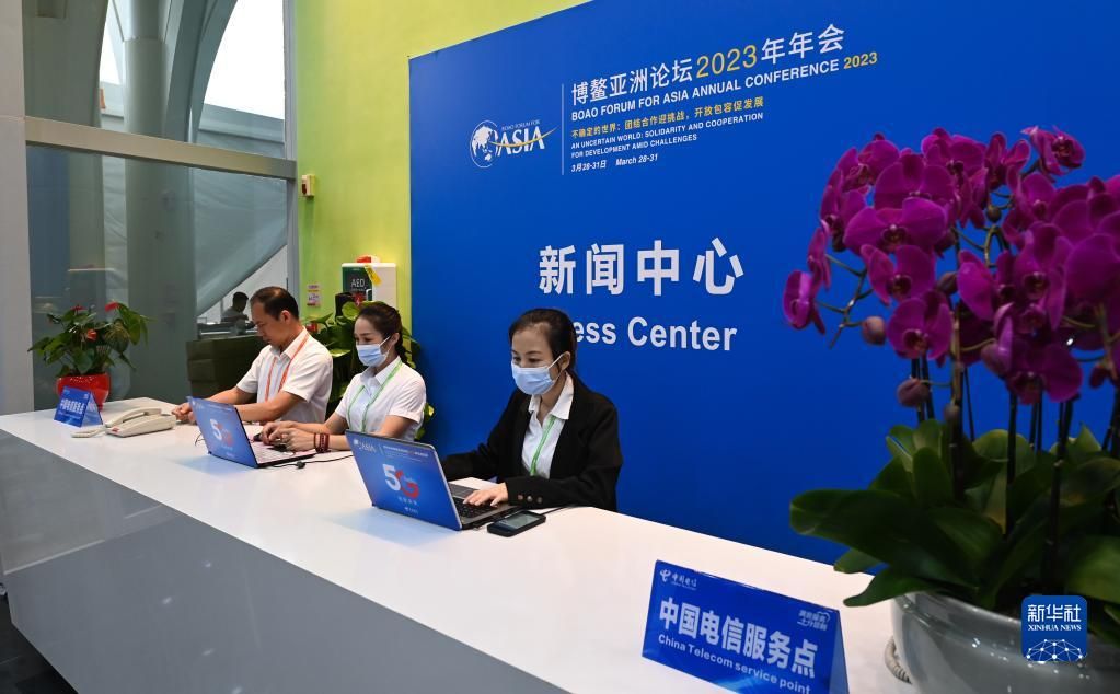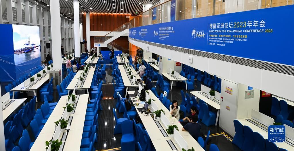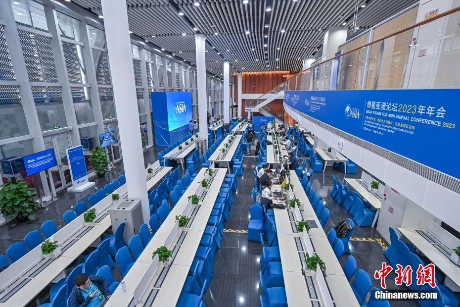 博鳌亚洲论坛2023年年会新闻中心媒体公共工作区。中新网
