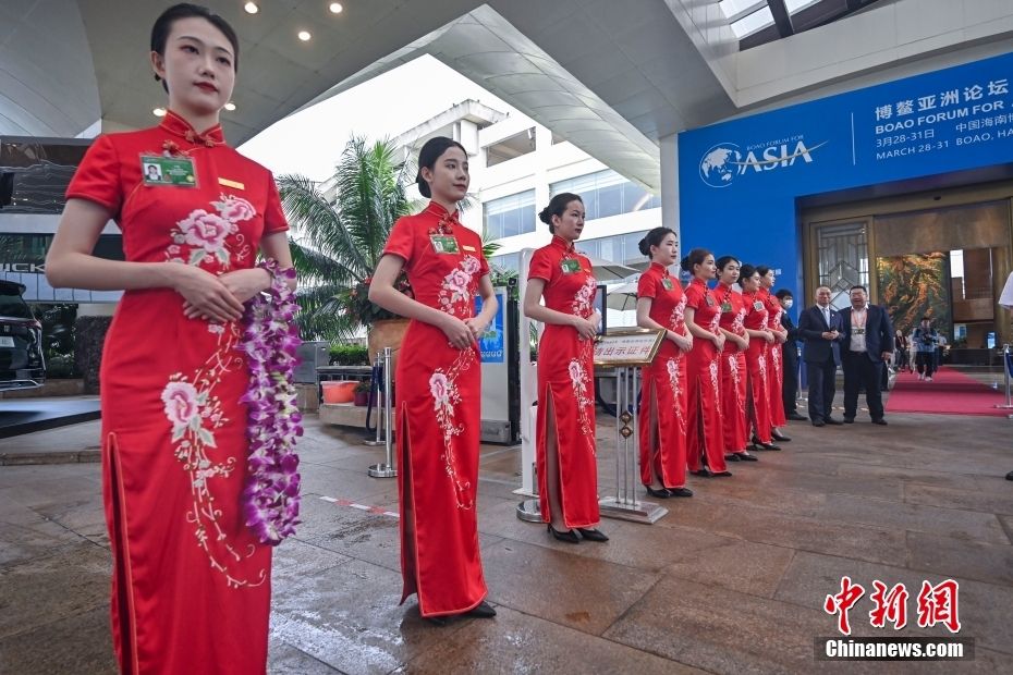 3月27日,身着旗袍的礼仪在博鳌亚洲论坛大酒店大堂迎接八方宾客。中新网