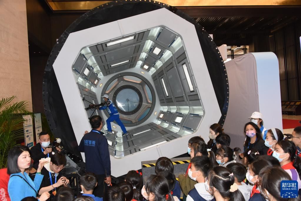 小学生在观看“流浪地球”太空舱演示项目。新华社