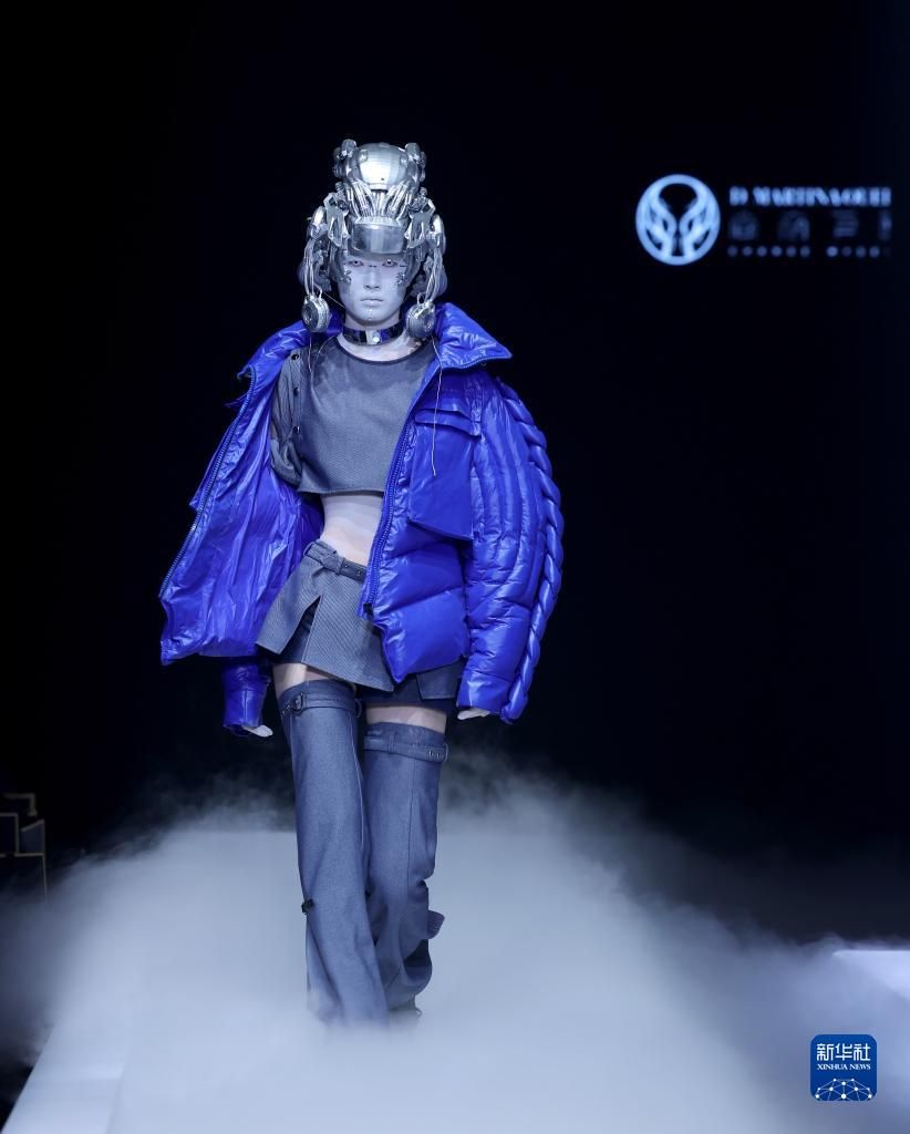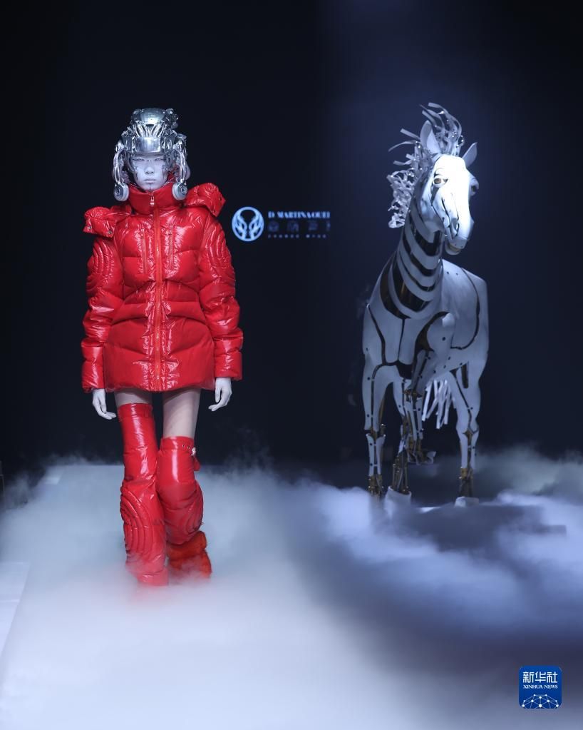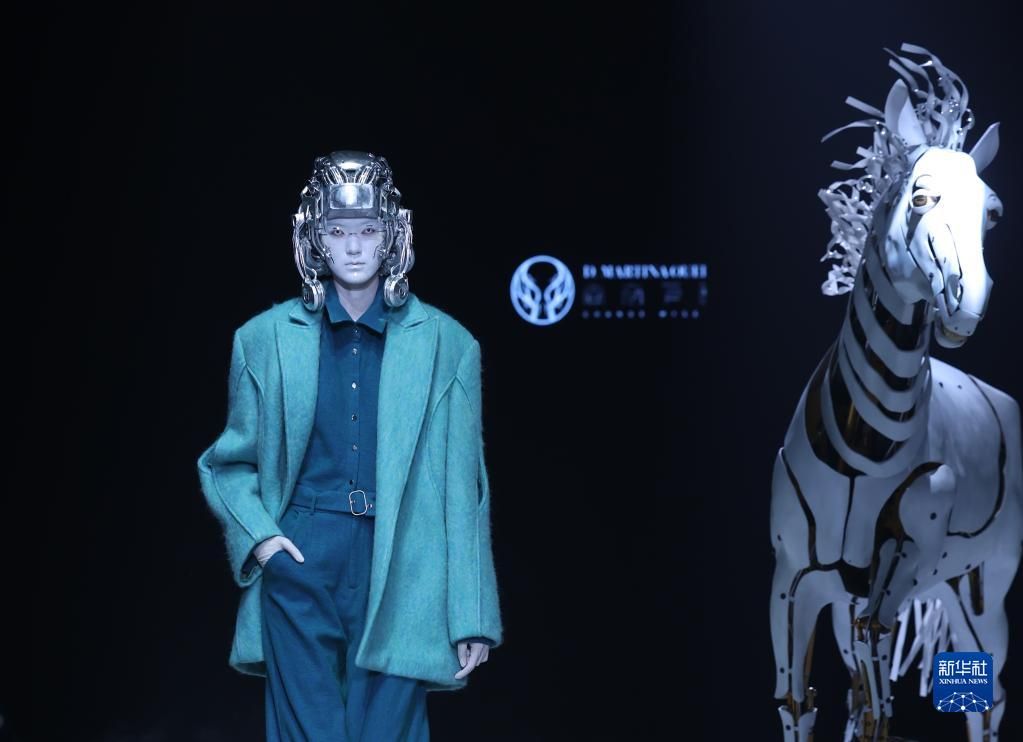 26日,主题为“视界·边界”的时装秀在北京举行的中国国际时装周2023秋冬系列上上演。设计师丁洁以妇好鸮尊为设计灵感,模特佩戴3D打印发饰,绕行秀场特别设置的“战马”,上演了一场历史与未来“时空对话”的时装秀。图为模特在展示设计师丁洁设计的时装。新华社