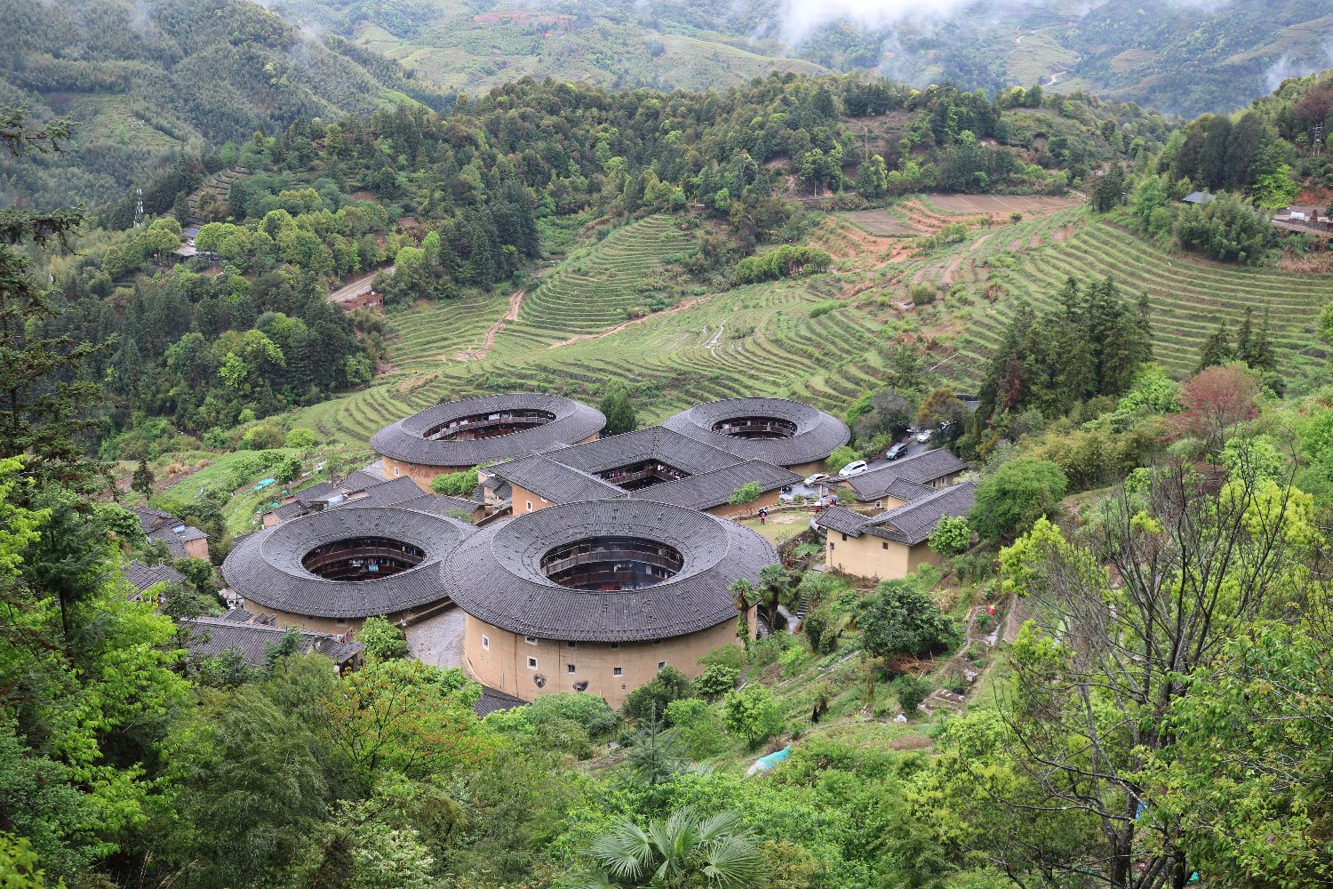3月29日,参与第五届“行走中国·海外华文媒体漳州行”的媒体代表们参访了福建漳州市南靖县的土楼。土楼遍布漳州市多个山区,因其奇特的造型和风格而闻名。图为别名“四菜一汤”的田螺坑土楼群,由一座方楼、三座圆楼和一座椭圆楼组成。田螺坑土楼群是福建客家土楼群的代表建筑,2008年,包含田螺坑土楼群在内的福建土楼被联合国教科文组织列入《世界文化遗产名录》。南美侨报特约记者乔颖摄