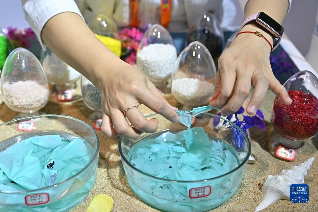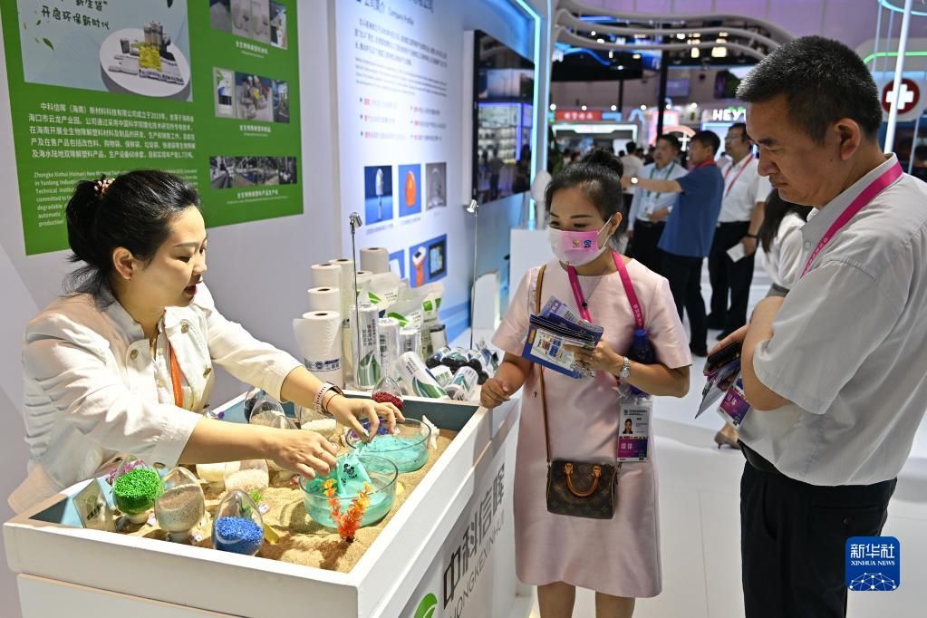 4月11日,消博会海南展台的工作人员介绍并展示快速降解材料。新华社
