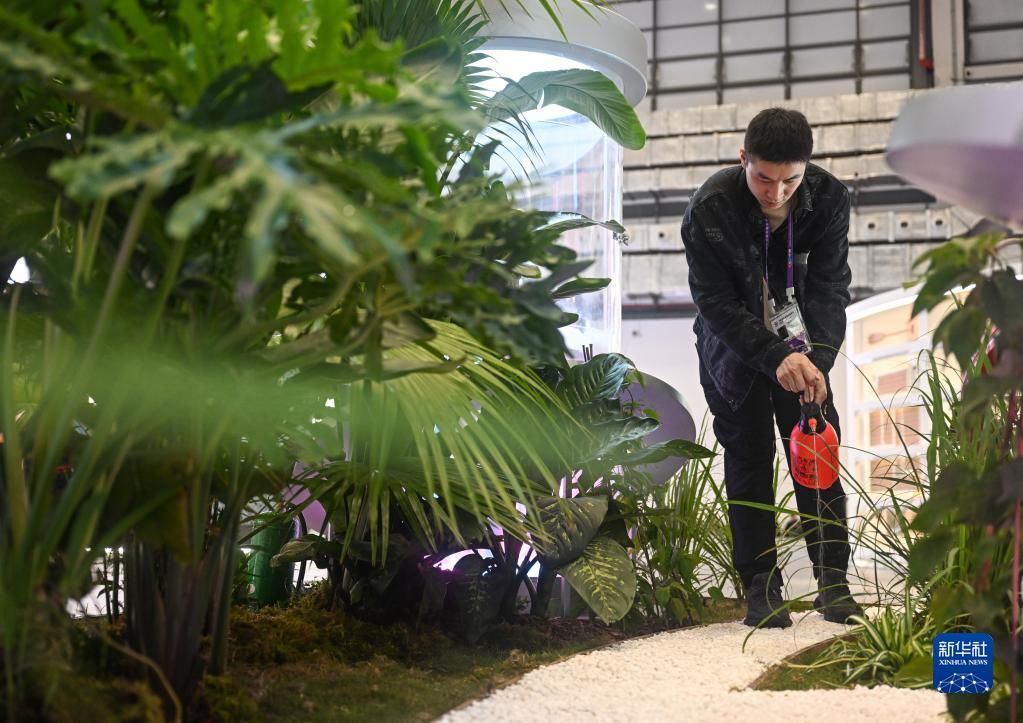工作人员为种植在消博会展台上的绿植浇水(4月8日摄)。新华社